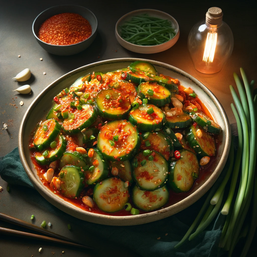오이소박이의 유래: 오이소박이(오이소박이)는 수세기 동안 한국 요리 전통의 일부였던 전형적인 한국 요리입니다. "소바기"라는 용어는 속을 채우는 과정을 의미하며, 이러한 맥락에서는 오이에 야채와 향신료를 섞어 맛나게 섞는 것을 포함합니다. 이 요리는 한국 요리의 필수 요소인 김치의 일종입니다. 김치의 역사는 고대 한국으로 거슬러 올라갑니다. 그 곳에서는 발효가 특히 길고 혹독한 겨울 동안 야채를 보존하는 중요한 방법이었습니다. 이러한 관행 덕분에 한국인들은 신선한 농산물을 구할 수 없는 경우에도 영양가 있는 야채를 접할 수 있었습니다. 시간이 지나면서 각기 다른 야채와 양념을 활용하는 다양한 종류의 김치가 진화했습니다. 오이소박이는 인기 품종으로 부상했으며, 특히 오이가 성수기인 더운 여름에 즐겨 먹습니다. 오이소박이는 상쾌하고 아삭아삭한 식감과 매콤한 메인 요리에 시원한 균형을 제공하는 능력으로 유명합니다. 한국 음식에서 종종 반찬(반찬)으로 제공되며, 식사의 다른 구성 요소와 질감과 풍미가 유쾌한 대조를 이룹니다.